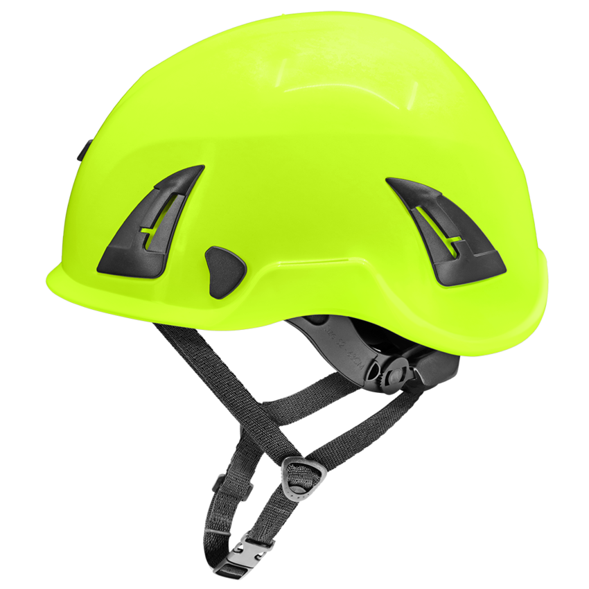 Bullhead Safety™ Head Protection - High-Visibility Yellow/Green Climbing Style Protective Helmet with Six-Point Ratchet Suspension and Four-Point Chin Strap