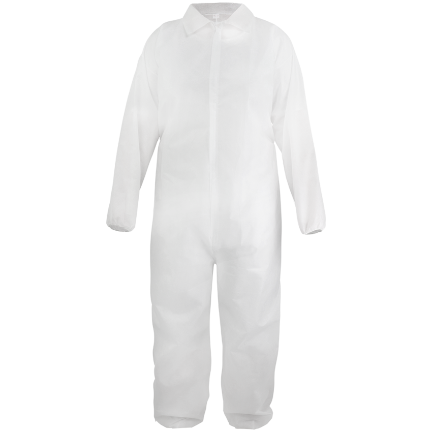 These disposable, non-woven coveralls are a great option for workers needing a durable coverall with light splash protection. They are low-lint and constructed with white, 50-gram SMS material. Reinforced triangle crotch and serged seams provide the user with more protection. Includes elastic ankles, waist, and wrists, and zipper closure with storm flap. Meets Type 5 & 6 protection. FDA compliant materials.