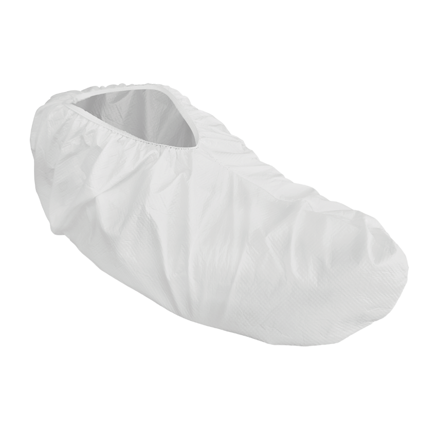 These non-woven shoe covers protect against dirt, grease, grime, and light liquid splashes. They are constructed with low-lint white, premium, 55-gram microporous PE film-laminated material that is breathable.