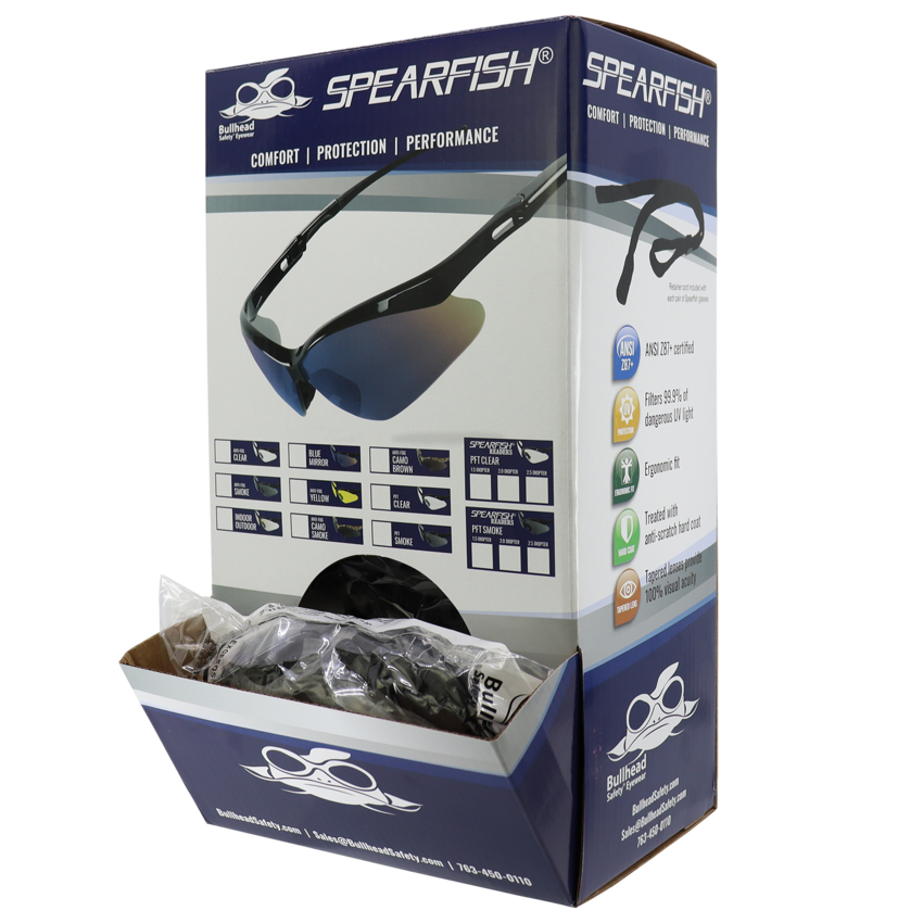 The Spearfish® has a flexible frame with vented temples, a TPR nose piece, and TPR temple ends. Designed to contour with the natural curvature of the head, the Spearfish® maximizes all-day wearability and comfort. \nEach dozen is packaged in a retail-ready box.
