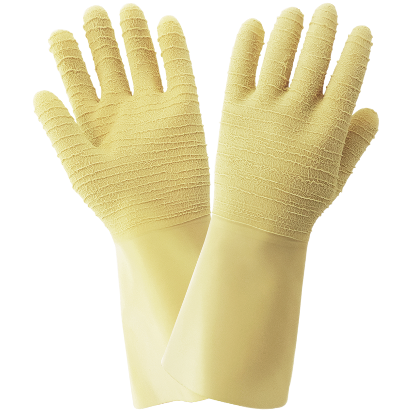 These 22-mil unsupported gloves are unlined and constructed with natural-colored rubber. The grip of the palm and fingers is enhanced with wrinkle pattern grip and the gloves are 13 inches in length.